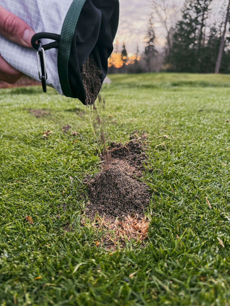 Depending on the course and the grass types, divot mix may be pure sand or it may contain seed to aid in recovery. Regardless of what's in the mix, the way to properly fill a divot is the same: Add mix until it is slightly below the height of the adjacent turf, then smooth the mix and press down with your foot.